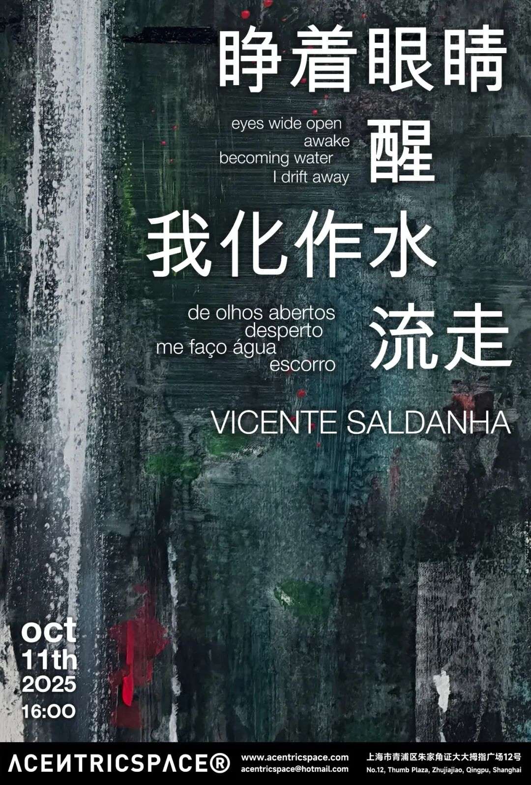 Vicente Saldanha’s experience during his residency in Zhujiajiao results in a multimedia and experimental body of work that expresses a vital stance in response to what unfolded: a state of sensitive wakefulness, an alert listening that liquefies into gesture, colour, and rhythm. Fluidity is more than a material—it is a condition of experience. Just as the canals of Zhujiajiao organise the flow of the place, his brushstrokes are currents that channel memories, moisture, impressions of the moment. The artist becomes water, pigment, in order to flow across the canvas, to move through media, to be kinesthetically touched by the stimuli offered to him. In this incessant flow, Saldanha becomes miscible—and, as he flows, he touches.
