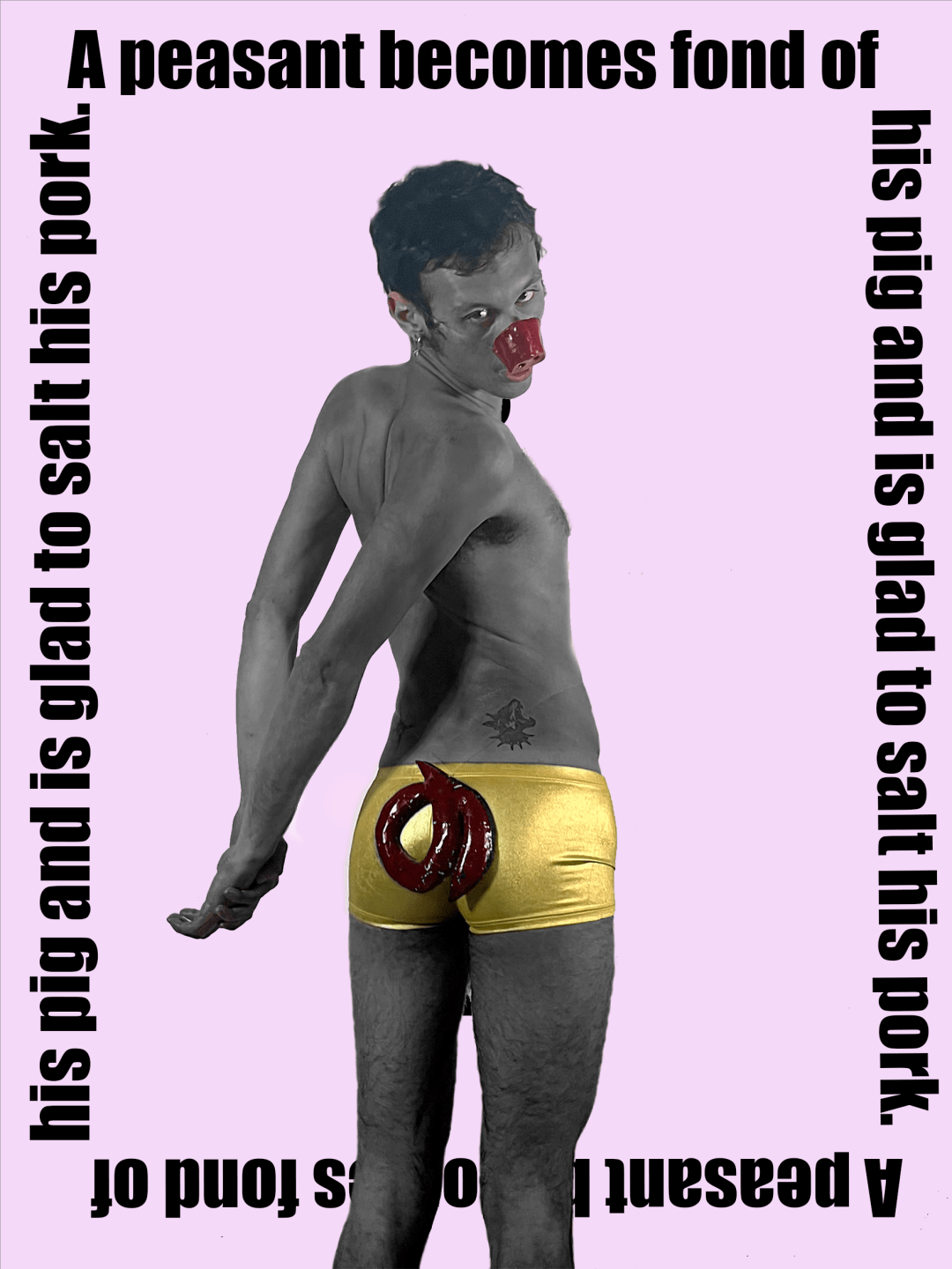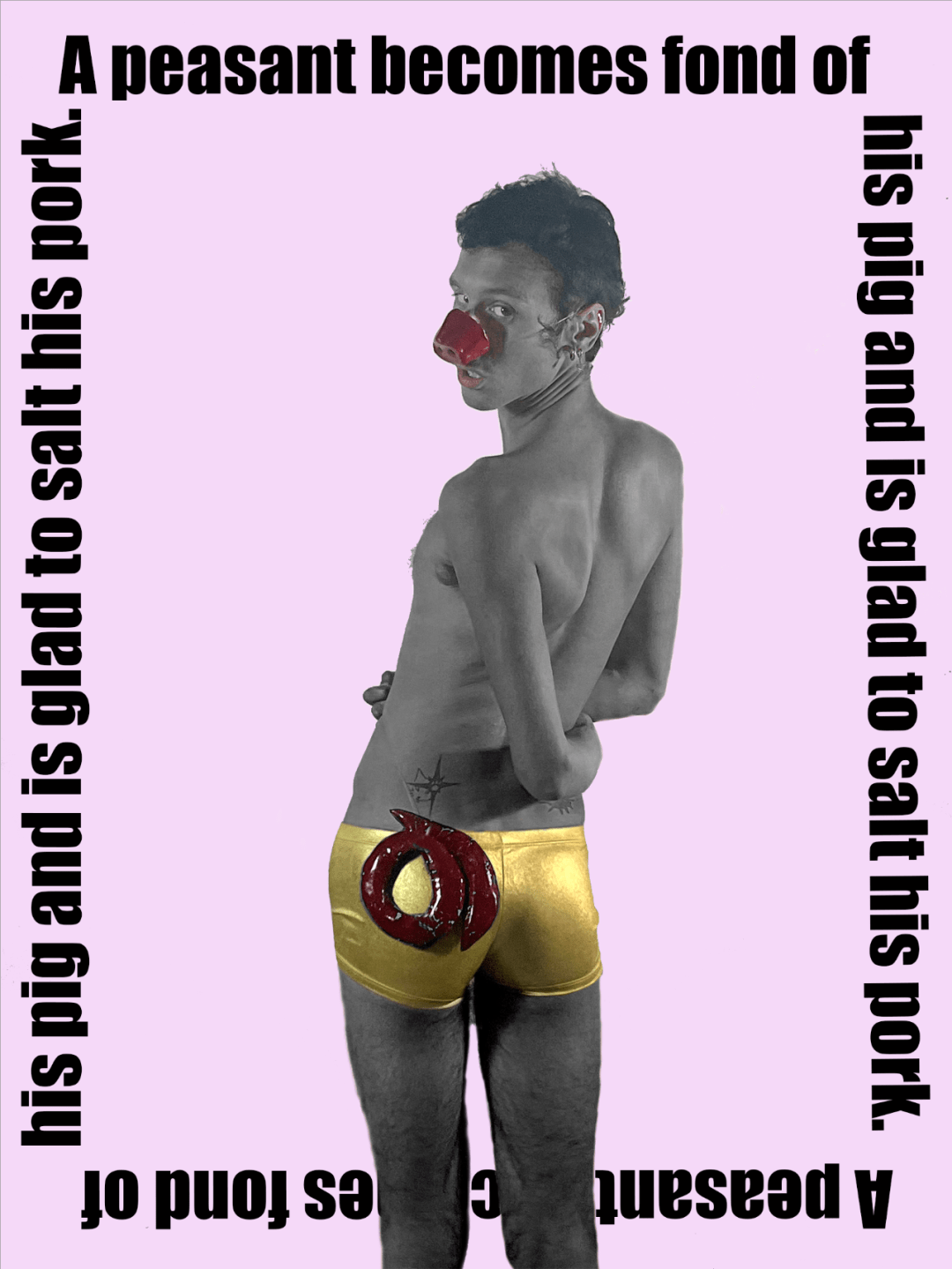 在这种文化差异的核心,艺术家也反映了个人经历,与他早年对性的思考产生共鸣。例如,在同性俚语中,“猪”或“像猪一样”指的是沉溺于短暂关系的不健康行为。这与同性群体中的过度消费密切相关。这种解读与中国文化中猪所象征的稳定、家庭生活完全矛盾。