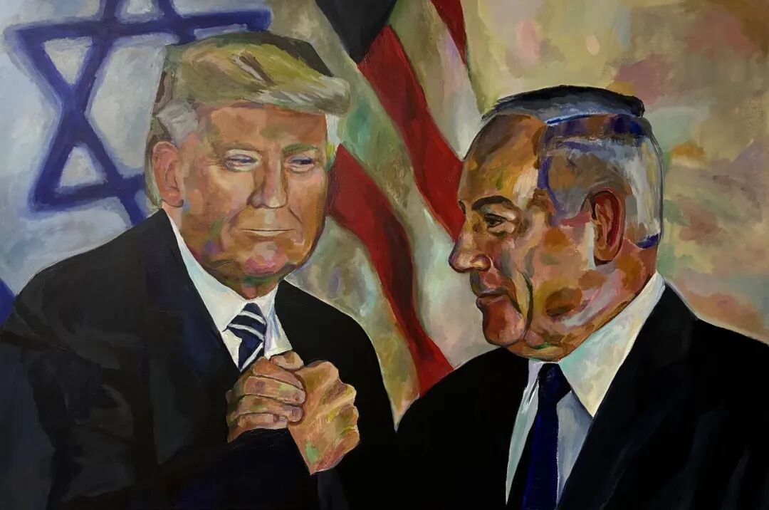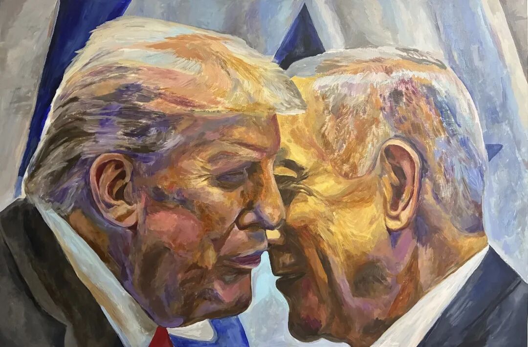 四幅画作勾勒出一段政治恋情的种种姿态:欲吻未吻、握手、牵手,以及那张仰起的面庞。伴随着一首经过混音处理的《Love Story》 – 在这首曲子中,泰勒·斯威夫特的副歌高潮被空袭警报与炸弹投落声撕裂,而特朗普口中的每一个“Baby”都变成了“Bibi” – 这件装置艺术消弭了浪漫与毁灭之间的界限。这种甜腻感正是其核心所在。在你意识到为此需要付出何种代价之前,你早已被其深深诱惑。