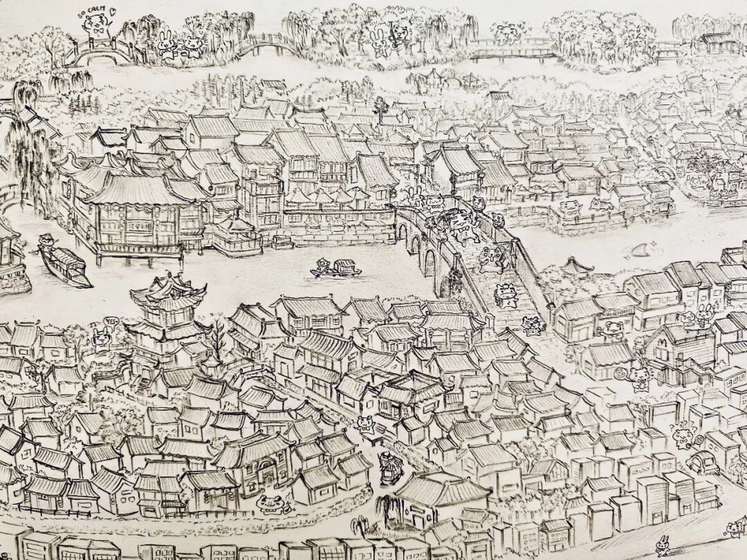 Along the Dianpu River in Shanghai is a residency work by Hong Kong artist Lamcat (Lam Suet-ying). The painting follows the Dianpu River, tracing a journey from Zhujiajiao to the Huangpu River, while also gathering fragments of daily life and shared experiences with four fellow resident artists.